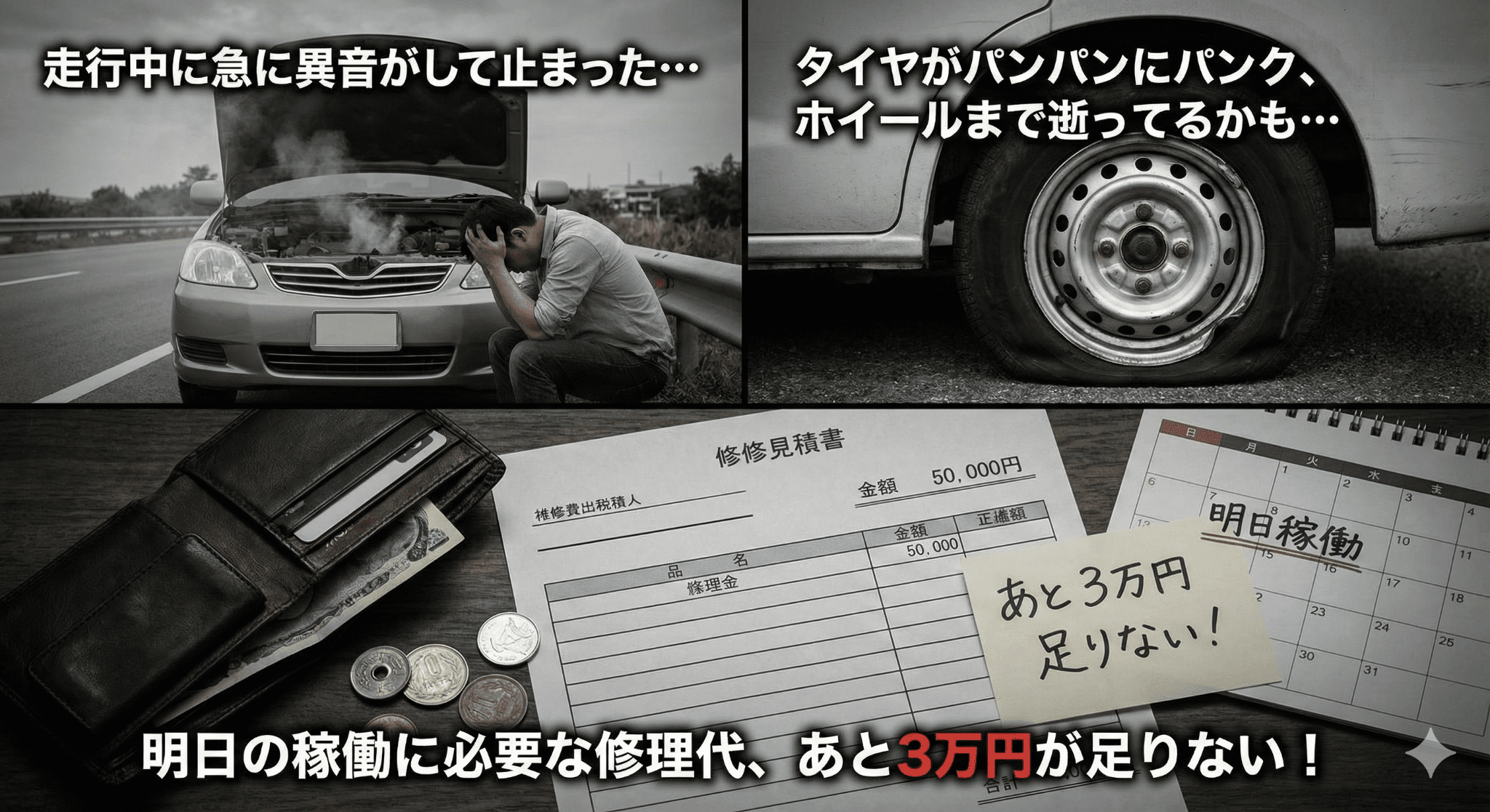 「走行中に急に異音がして止まった…」 「タイヤがパンパンにパンク、ホイールまで逝ってるかも…」 「明日の稼働に必要な修理代、あと3万円が足りない!」